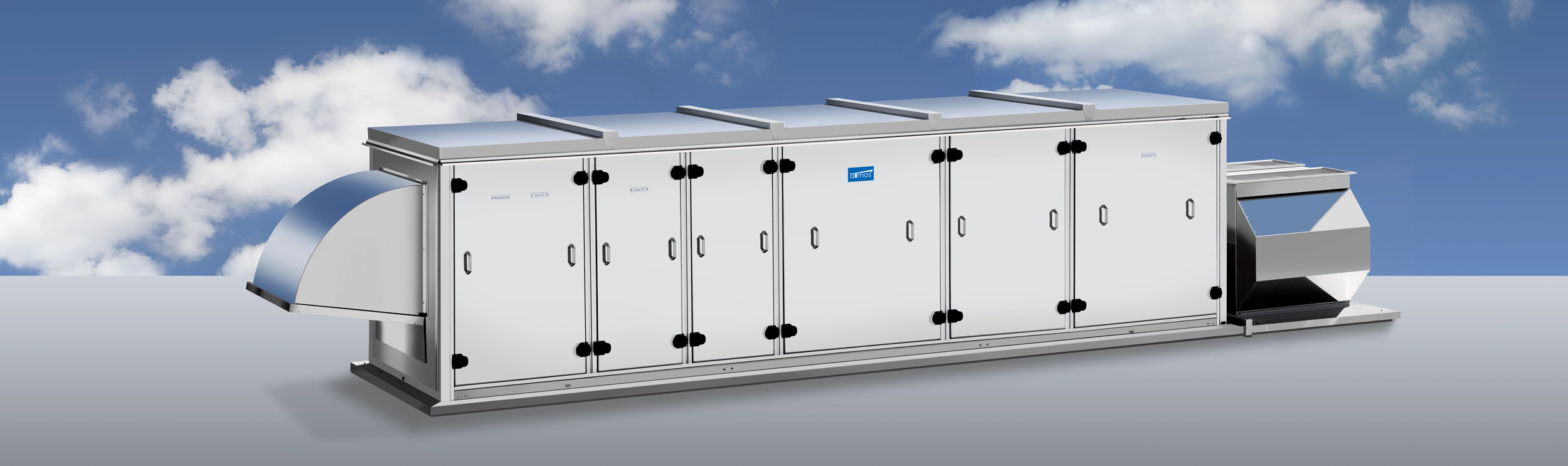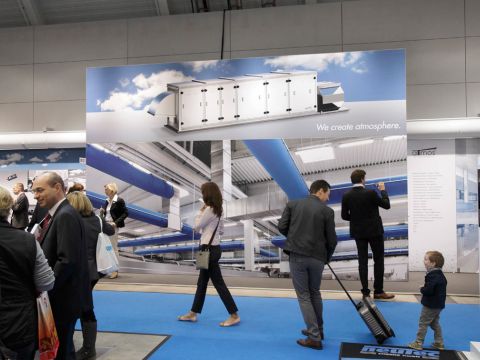 Panorama-Montage der Entlüftungsanlage über 180° innerhalb der Produktionsstätte von Görtz in Ludwigshafen und Dach-Entlüftung als Hauptbilder des Messestandes auf der Südback in Stuttgart.