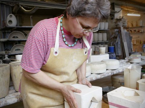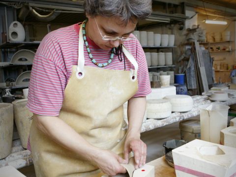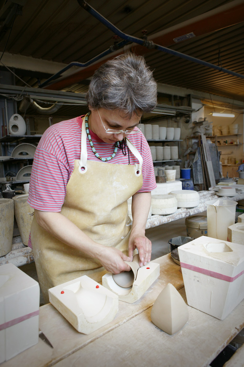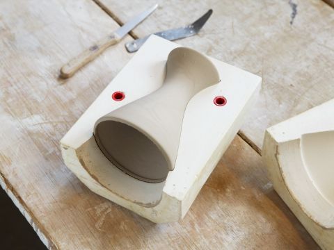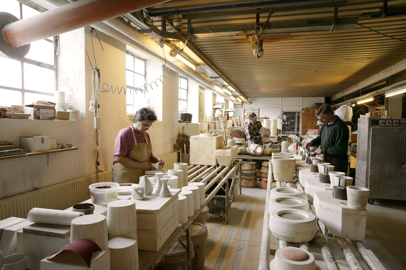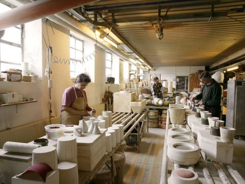 "Die Krönung der Keramik ist das Porzellan. Die Rezepturen und Verfahren zur Herstellung des "weißen Goldes" wurden über Jahrhunderte als Staatsgeheimnis gehütet und waren nur wenigen zugänglich. Besonders der Guss gilt nach wie vor als anspruchsvollster Arbeitsschritt. Um bei der Herstellung der Leuchtkörper eine gleichmäßige Wandstärke zu erzielen, erfordert das Einfüllen der Porzellanmasse Fingerspitzengefühl und jahrelange Erfahrung. Nach der Standzeit ist das Porzellan noch sehr weich. Vorsichtig werden die noch rohen Leuchten aus den Formschalen gelöst.