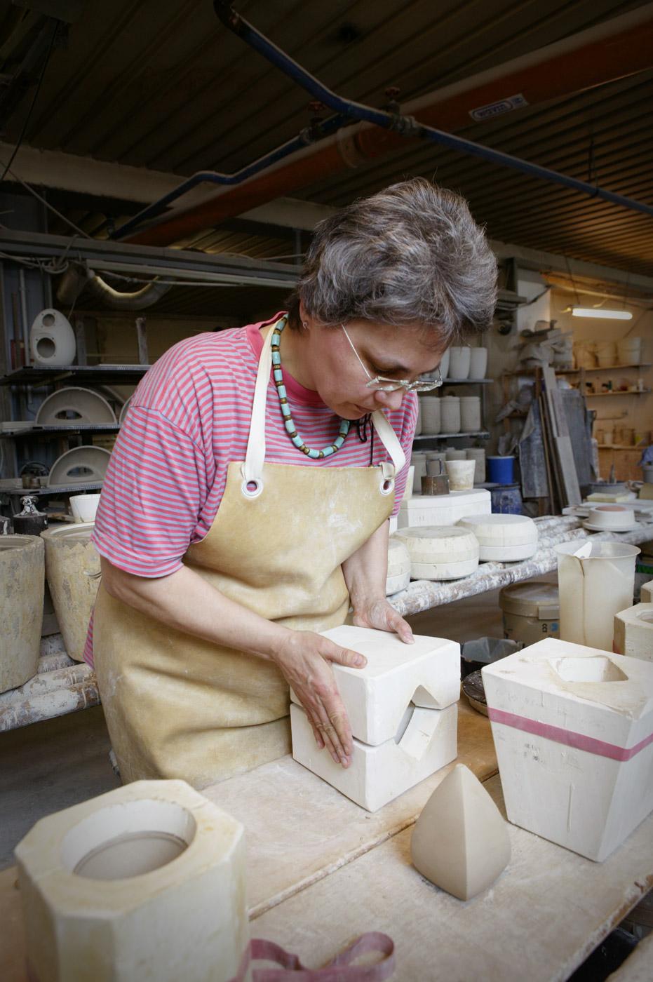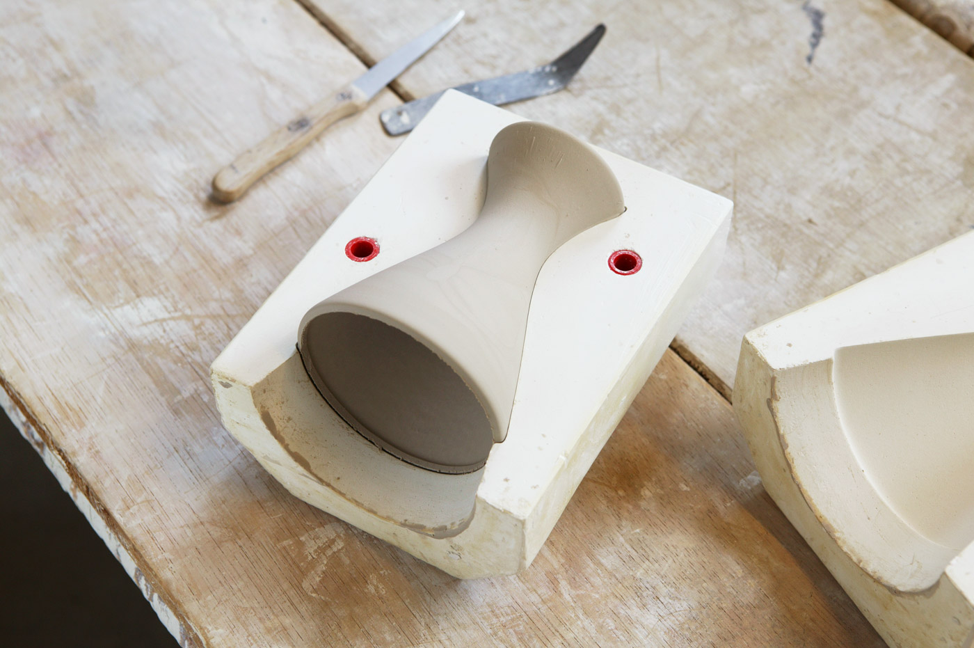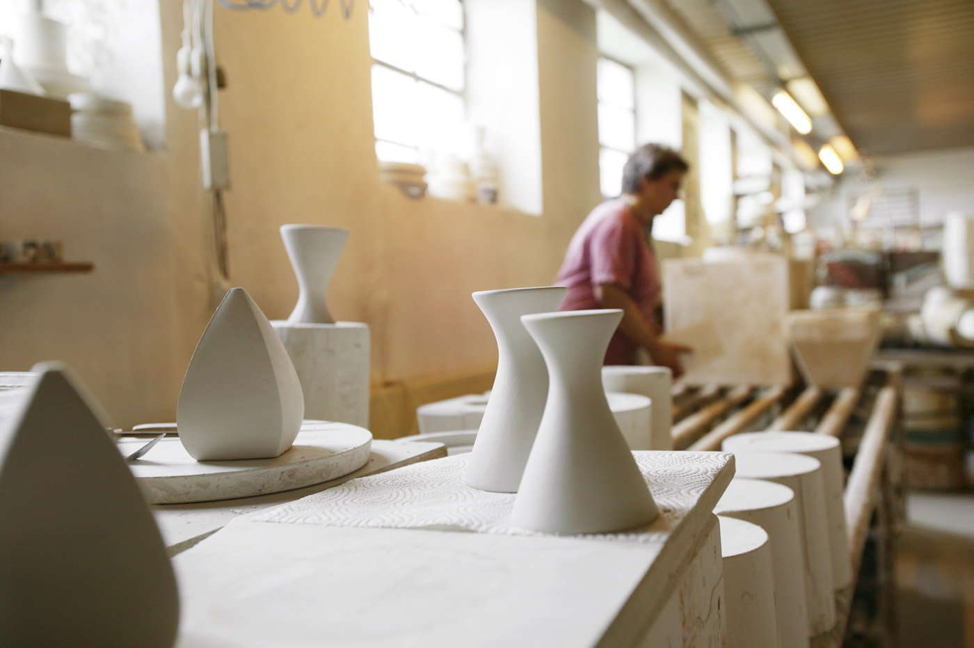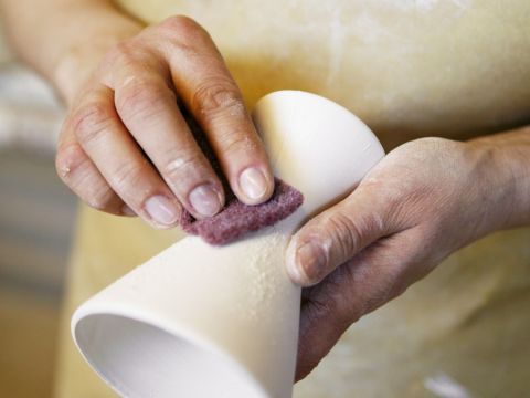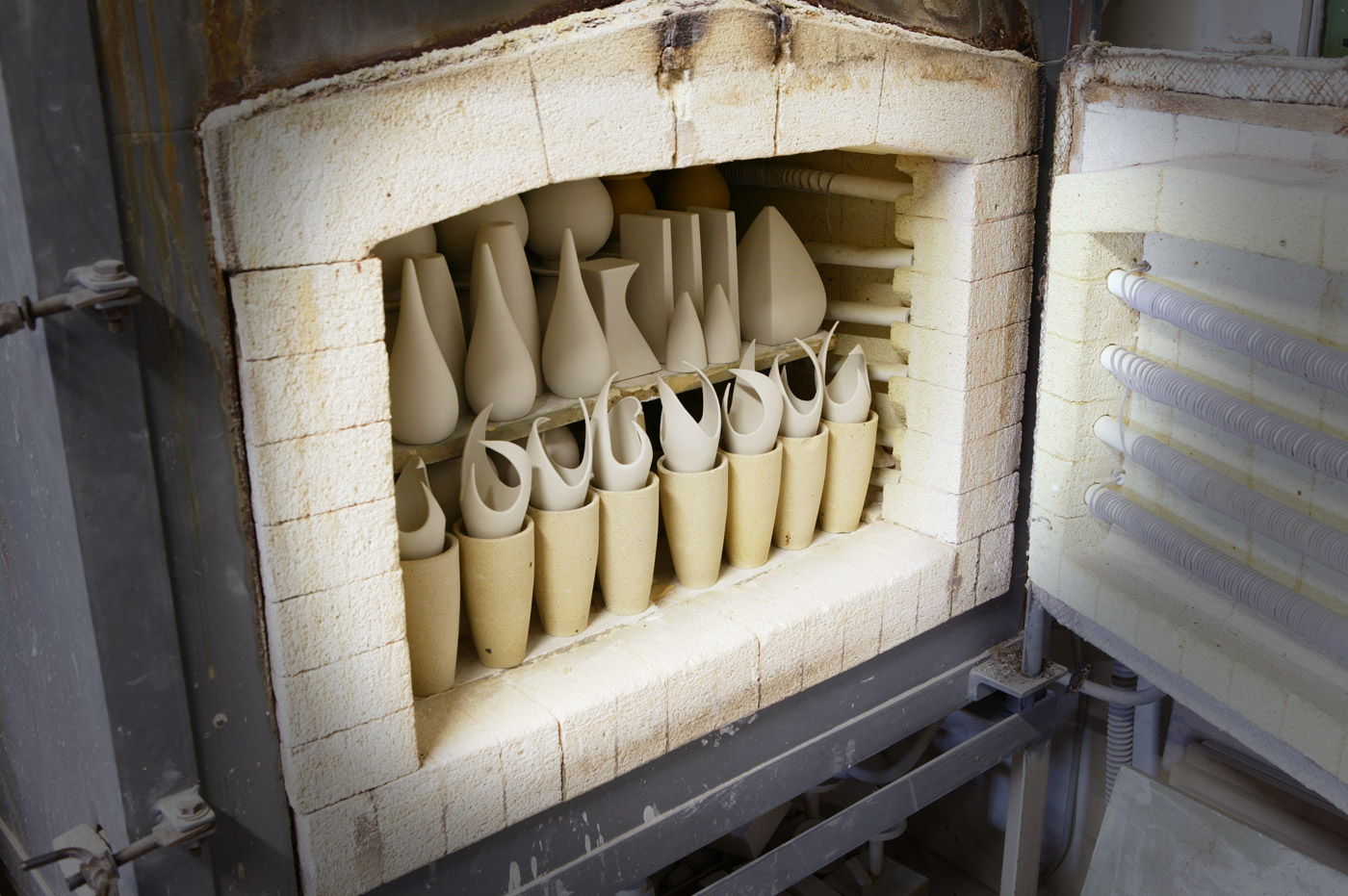 Nach dem Trocknen und vor dem Brennen, das ungefähr 3 Tage dauert und bei einer Hitze von ca. 1200 Grad Celsius stattfindet, beginnt der Feinschliff. Da es sich um "Biskuit-Porzellan" handelt, dessen Oberfläche unglasiert, aber wasserundurchlässig ist, kann die Leuchte mit verschiedenen Werkzeugen nachbearbeitet werden, ohne Schaden zu nehmen. Jedes einzelne Stück wird von Hand mit dem Messer von groben und feinen Schwämmen, von Kanten und Fissuren befreit."