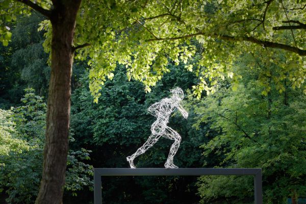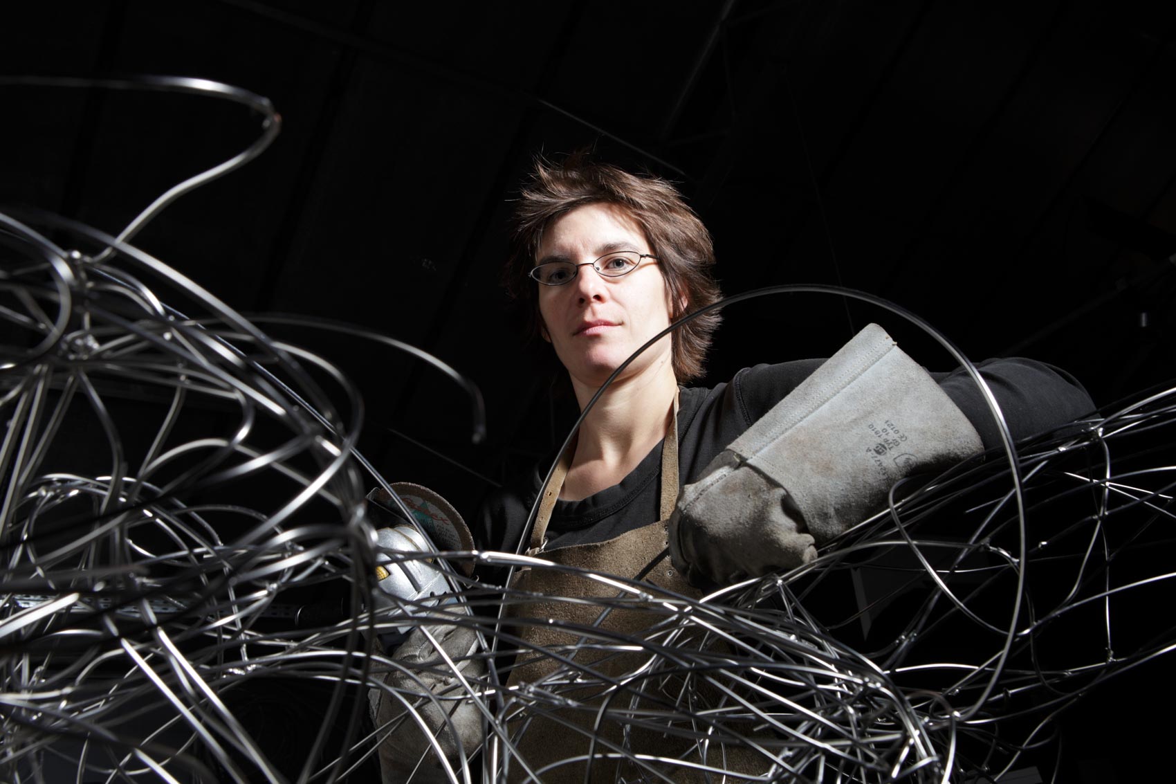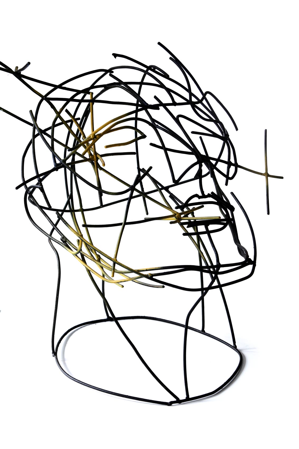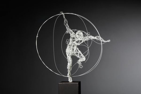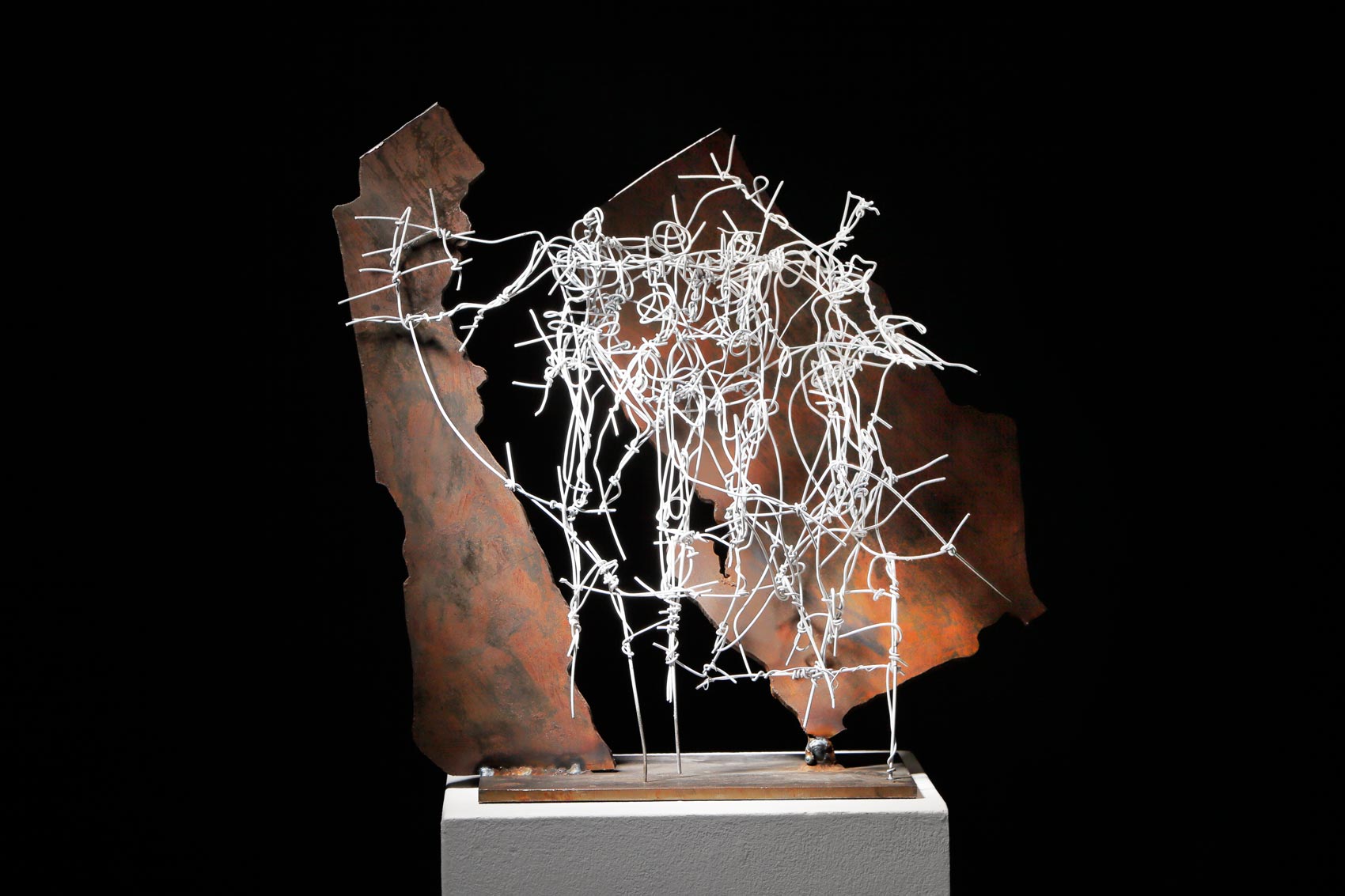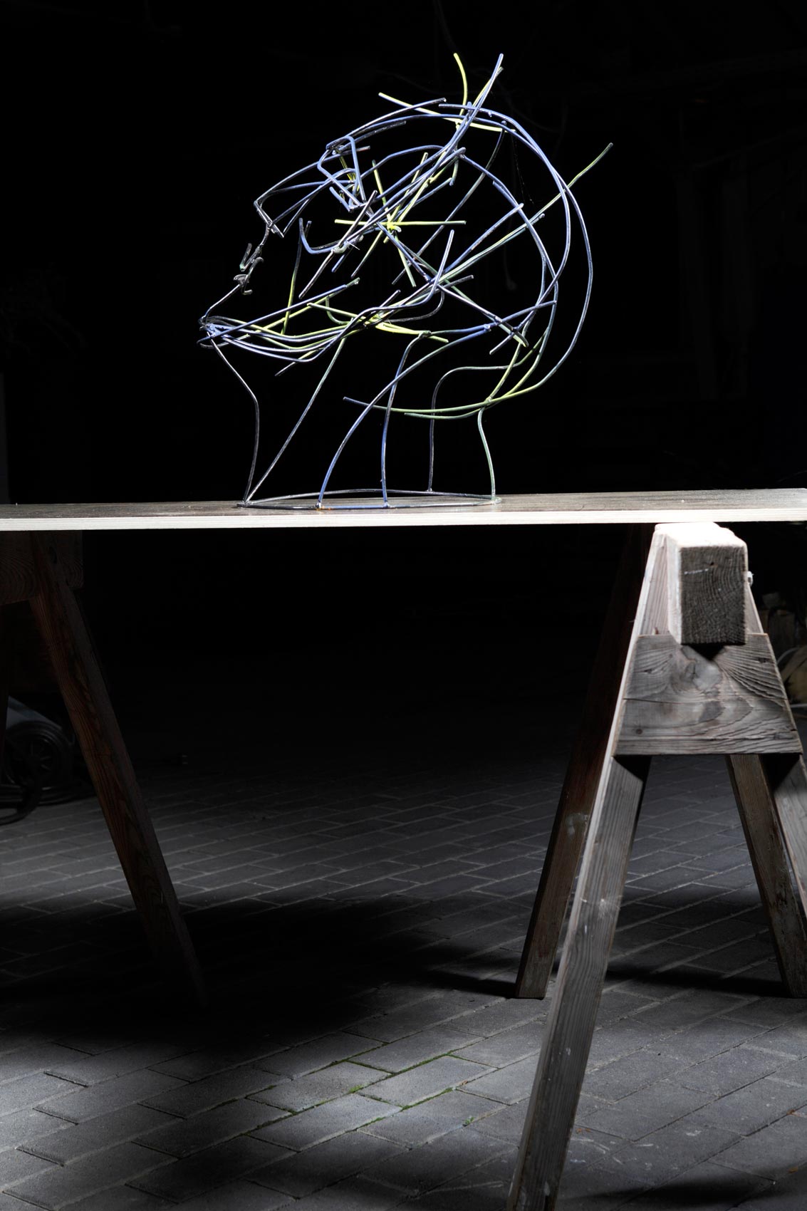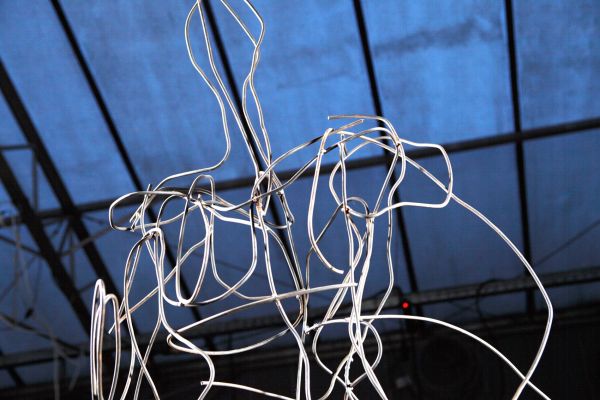 "Mein Material Draht erlaubt es mir, hinter der Materie liegende Räume, Schwingungen, Felder oder Bewegung sichtbar zu machen. Einerseits verschwindet so das vordergründig Schwere, Feste und Abgegrenzte und eine energetische Realität zeigt sich, indem Körpergrenzen sich auflösen und pulsieren. (Text von Stefanie Welk).